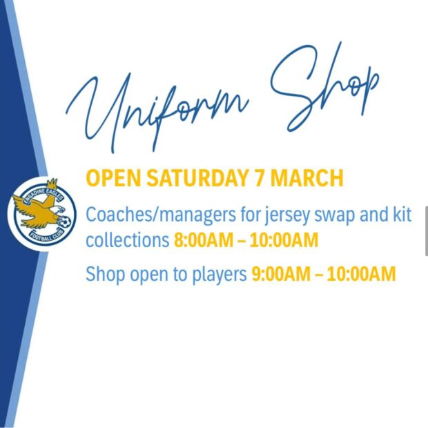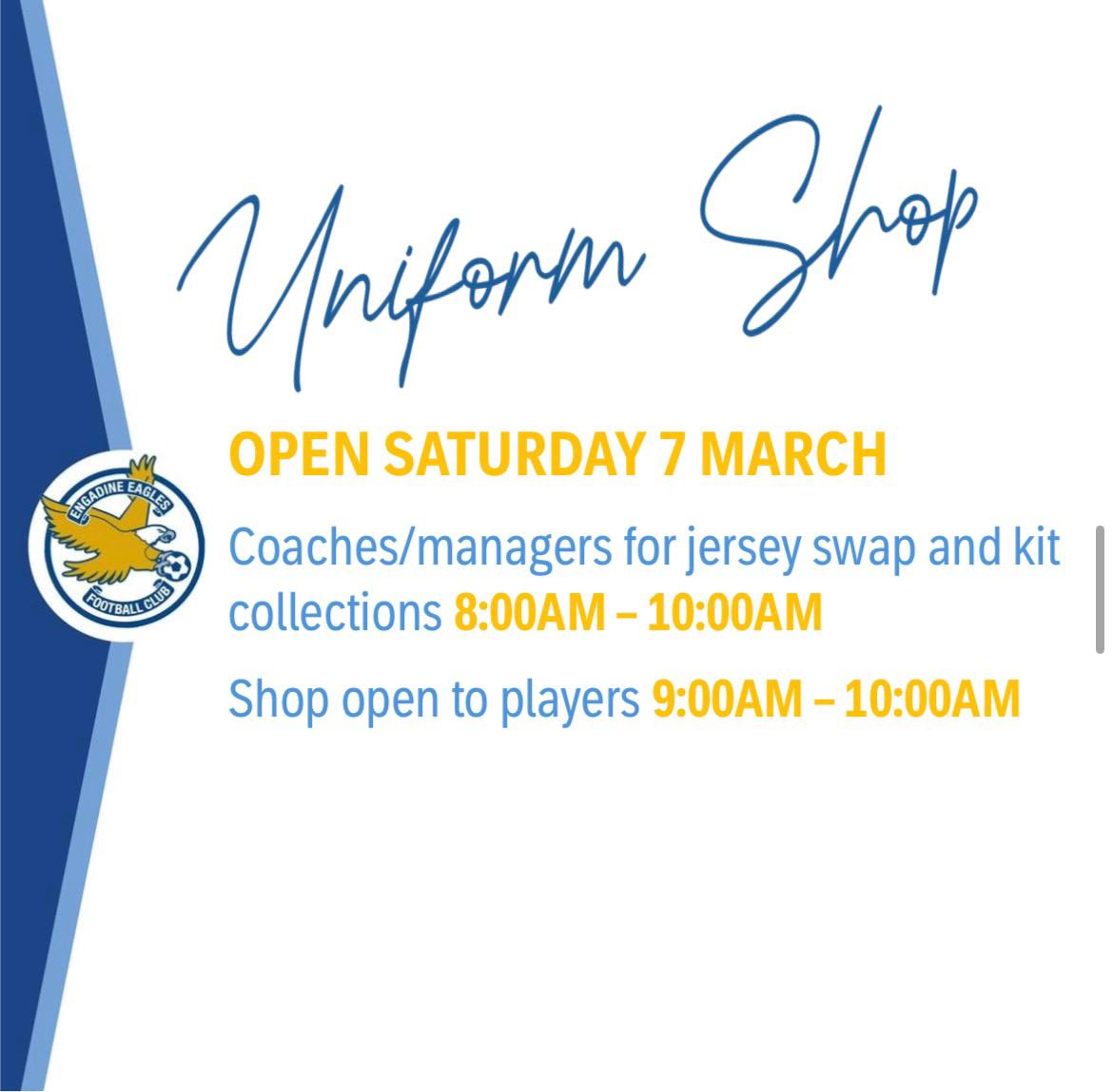 Coaches and managers, the uniform shop will be open for jersey swap and kit collection, Saturday 7 March: 8-9am