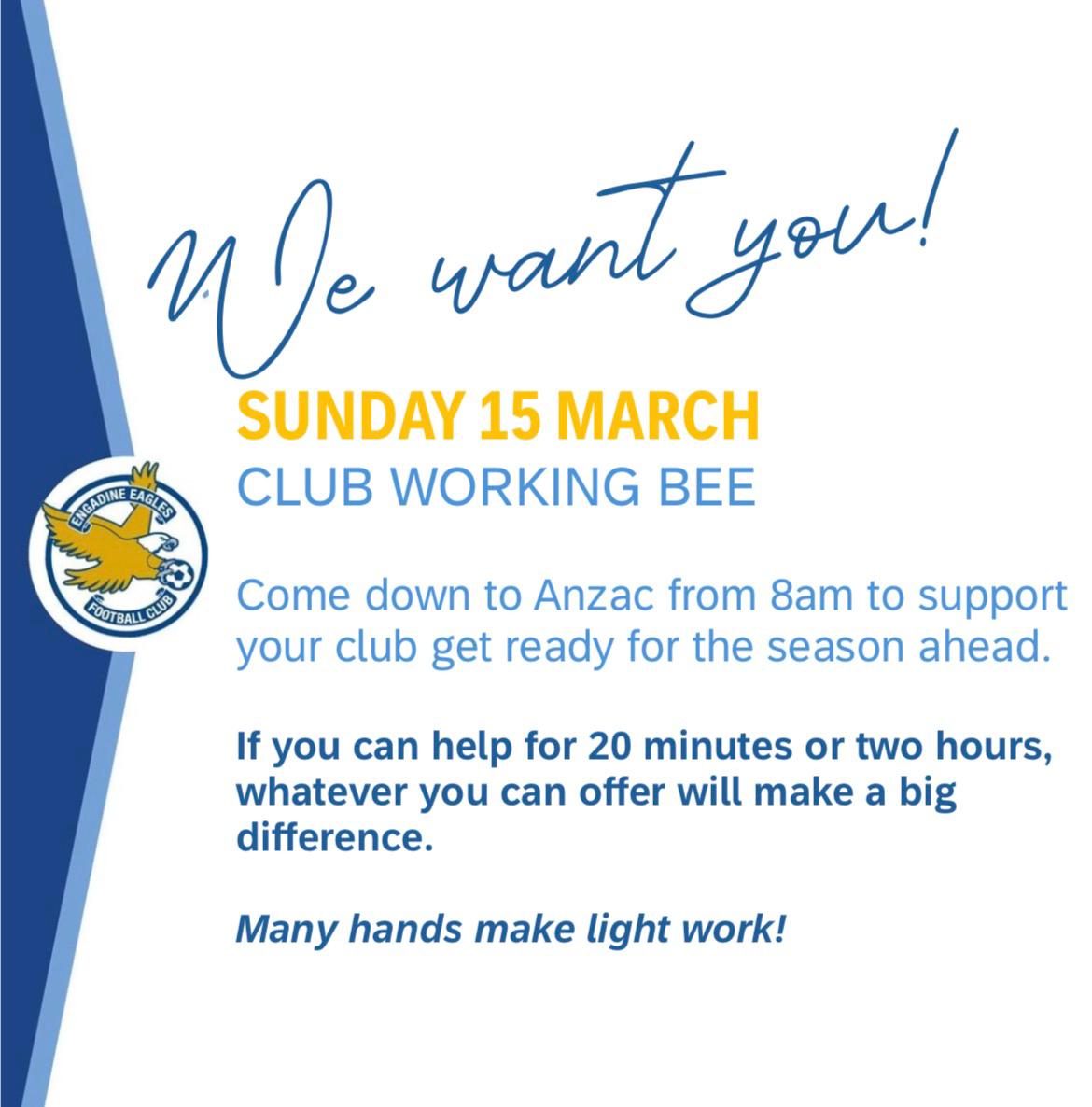 Help us get Anzac Oval and the Engadine Eagles clubhouse season ready by lending a hand at our 2026 Working Bee 🐝 Are you handy with the edge trimmer? Skilled at marking lines? Or just keen for an early morning workout? Come down to Anzac Oval on Sunday 15 March from 8am to help the club get ready for that first whistle of Round 1! Whether you can make it for 20 minutes, two hours, or anywhere in between, any help will be greatly appreciated.
